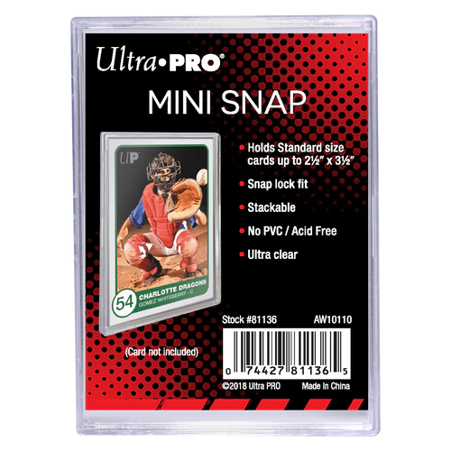 Holds 2-1/2" x 3-1/2" (63.5 mm x 88.9 mm) standard cards. Two-piece ultra-clear holders with snap-tight closure and minimal trim. Can be stacked for easy storage and transport. Made with PVC-free and acid-free materials.
